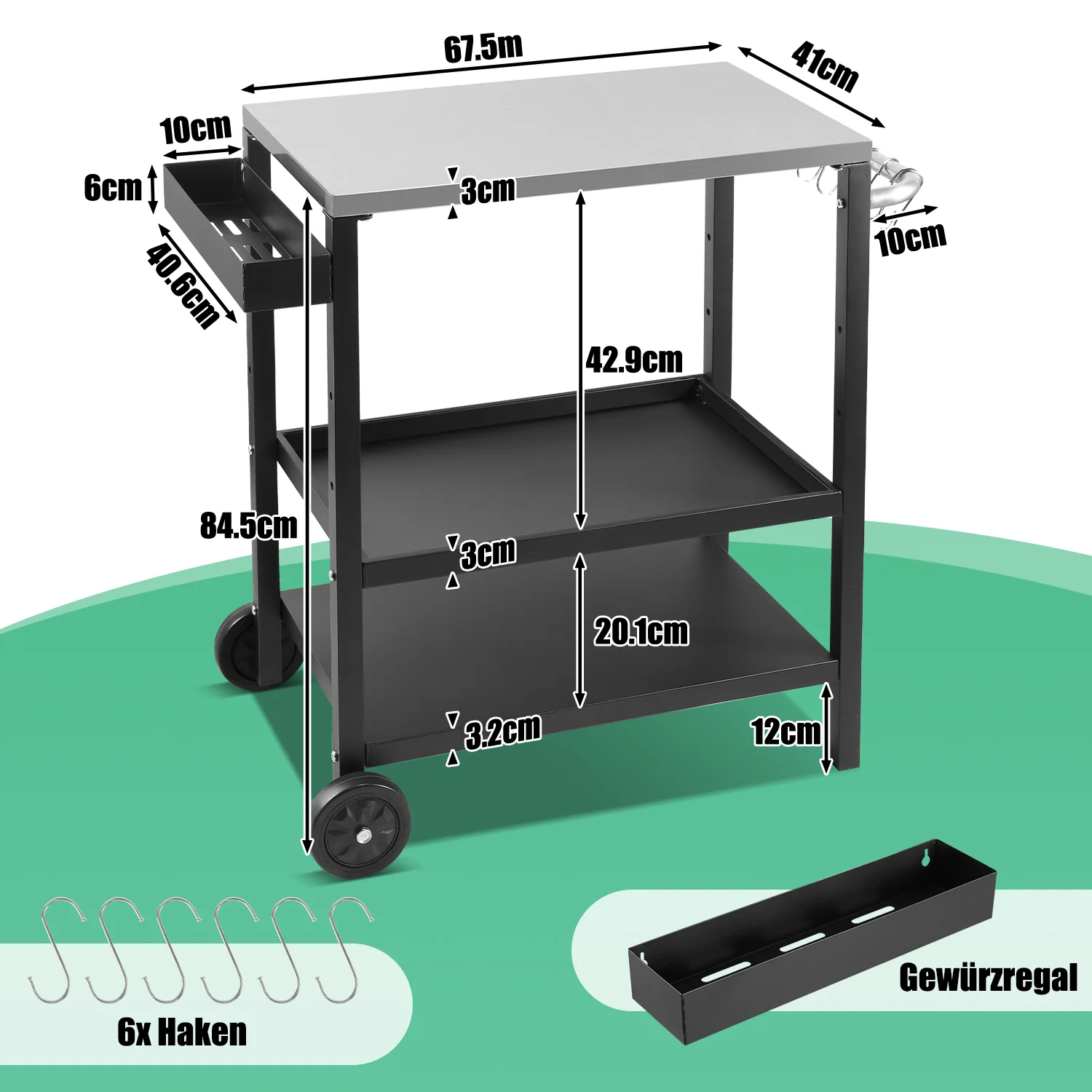Grillwagen Grilltisch Höhenverstellbar mit 3 Ablagen BBQ