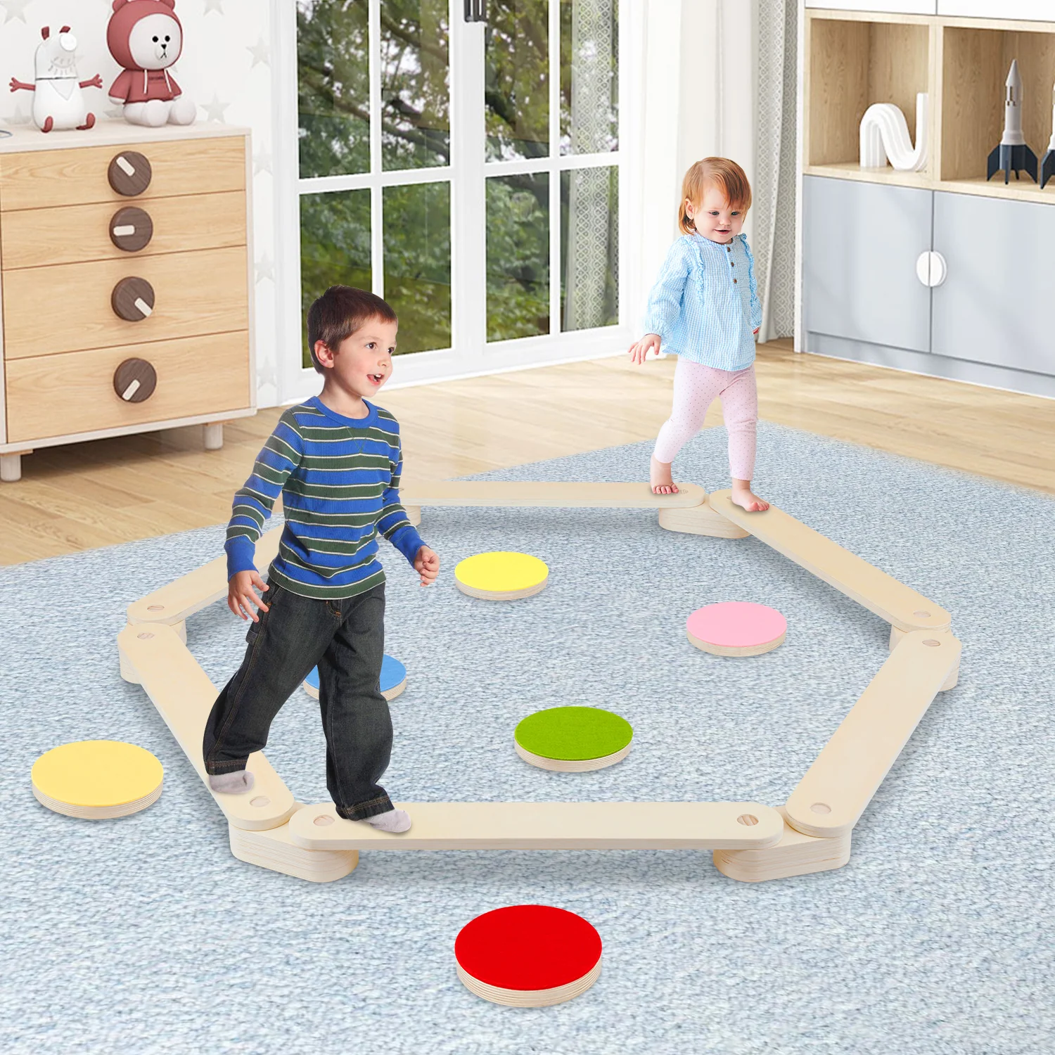 Balancierbalken aus Holz mit 6 Balanciersteine für Kinder