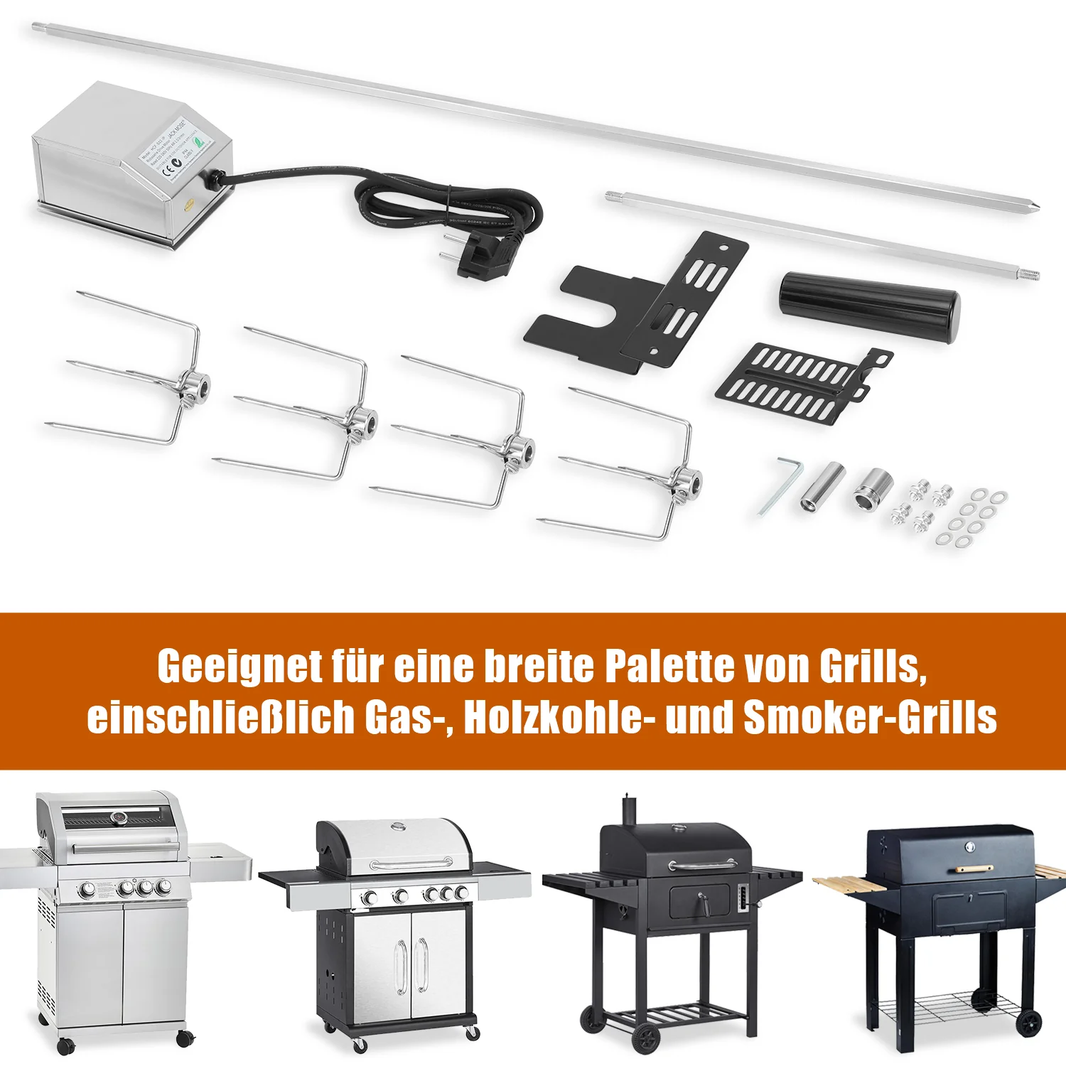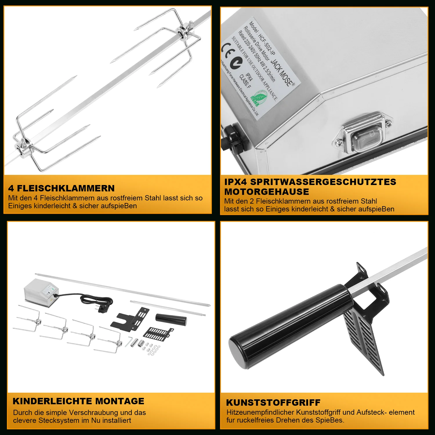 BBQ Grillspieß Edelstahl Motor 4x Fleischnadel