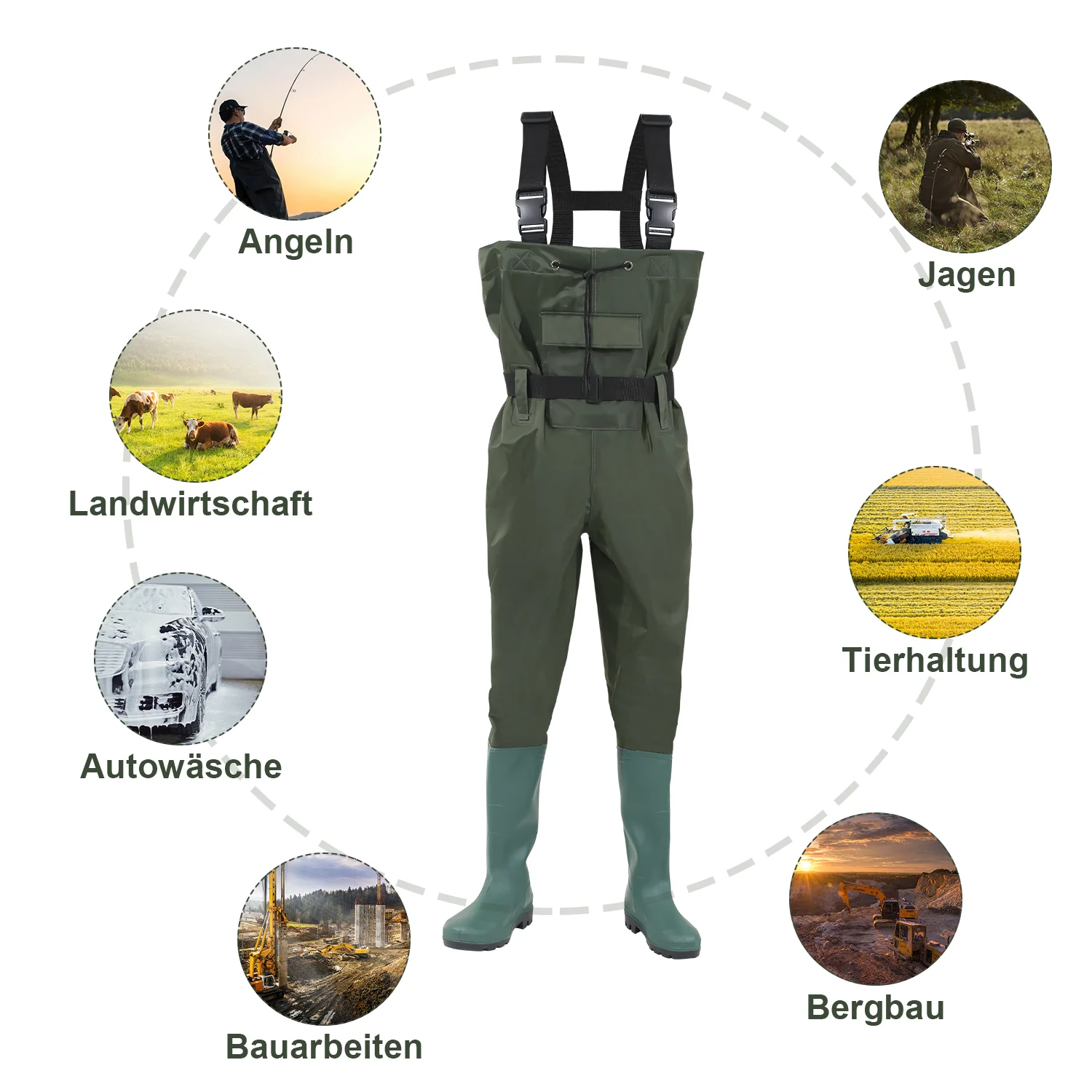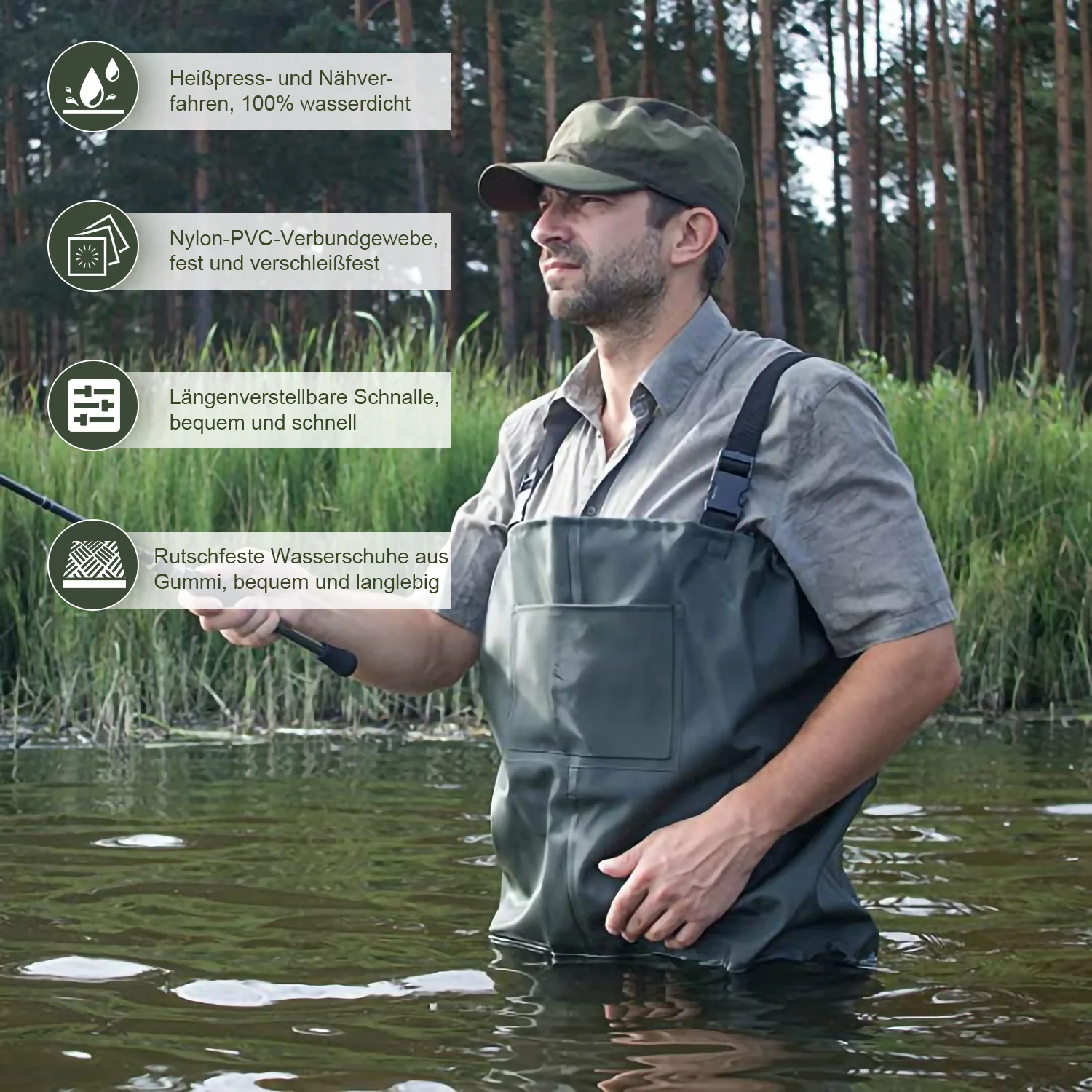 Wathose mit Gummistiefeln, Bund und Haken