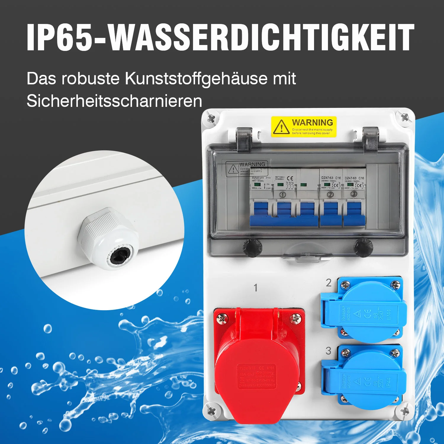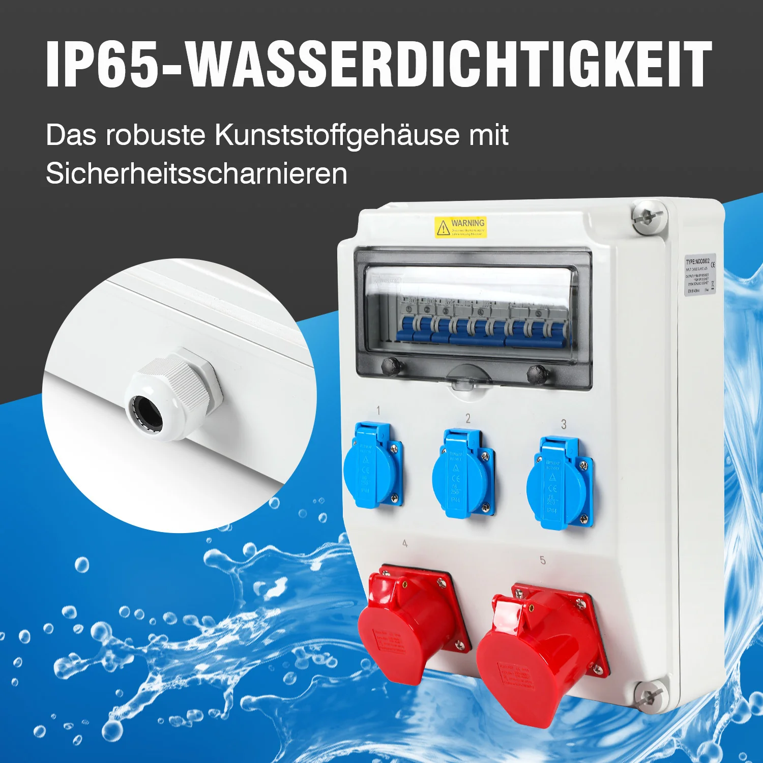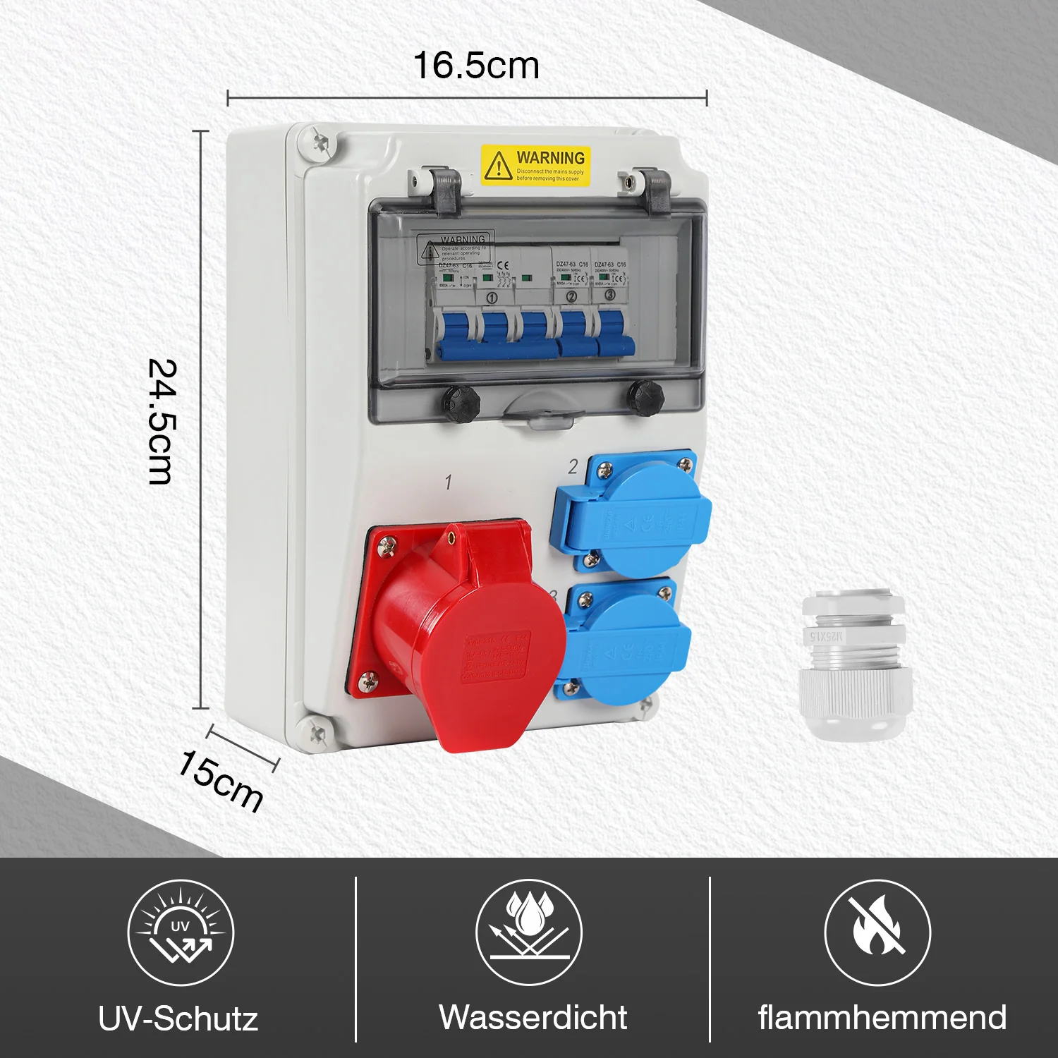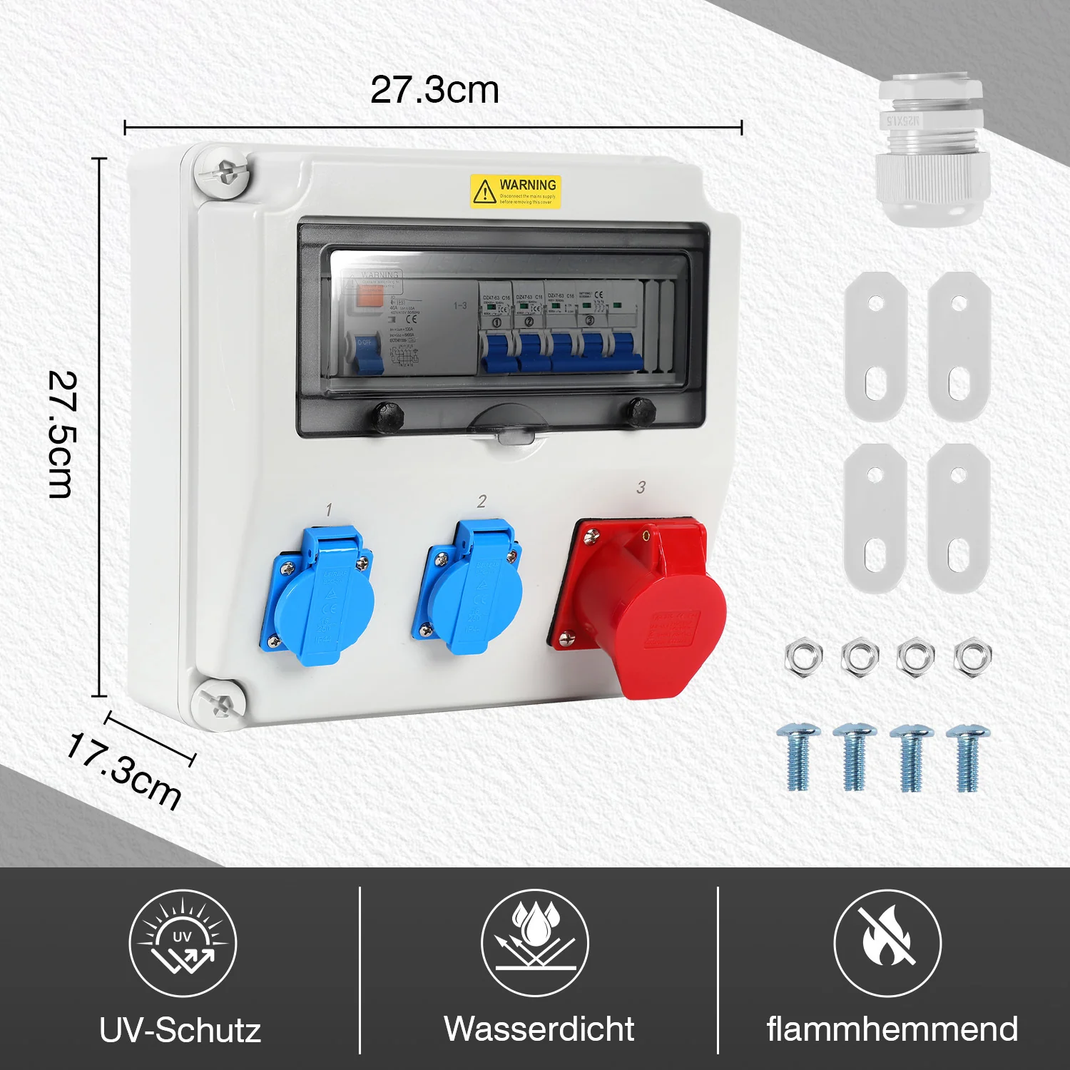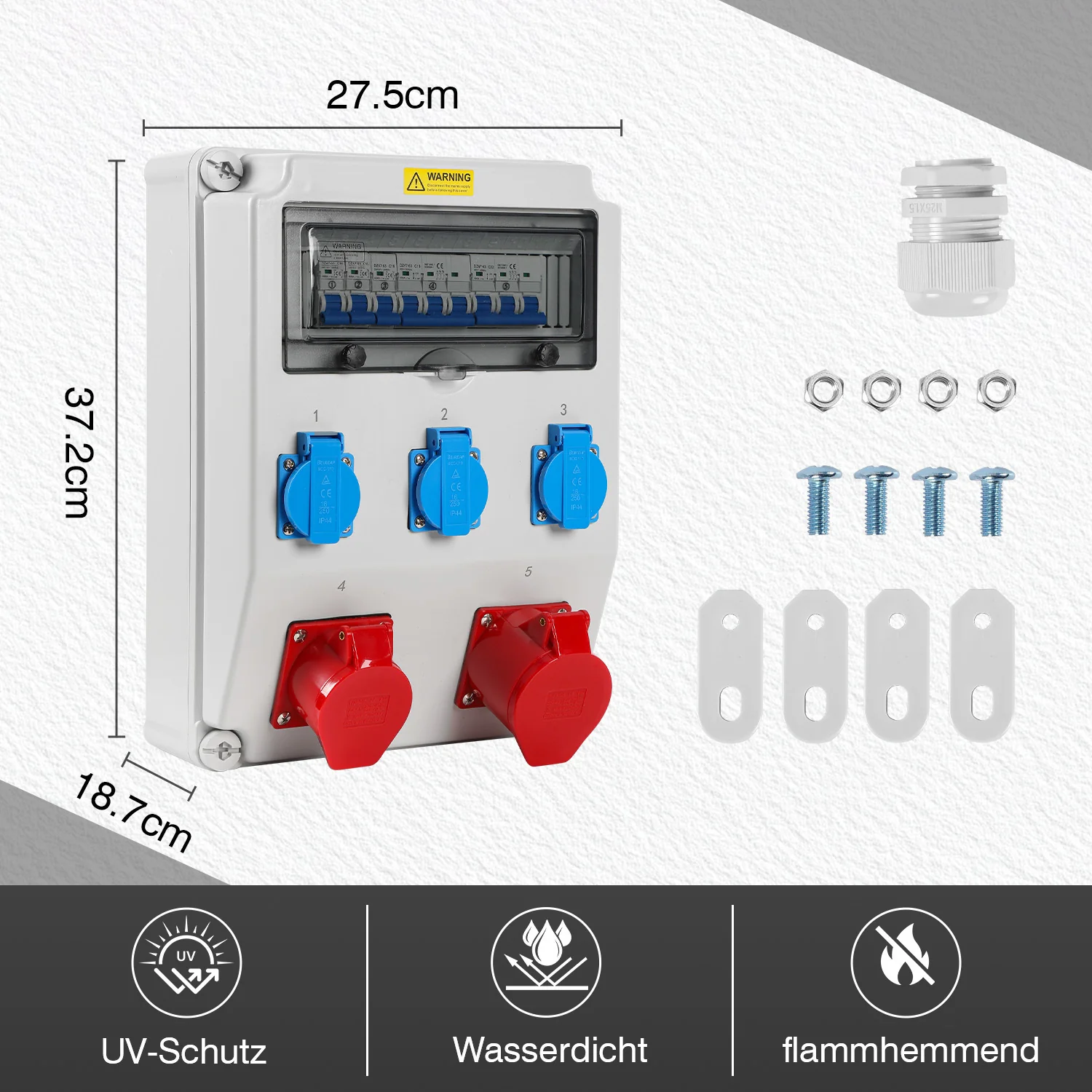 Wandverteiler mit Leitungsschutzschalter,5 Polig Baustromverteiler mit 3xSchuko-Steckdose und CEE-Steckdose 16/32A