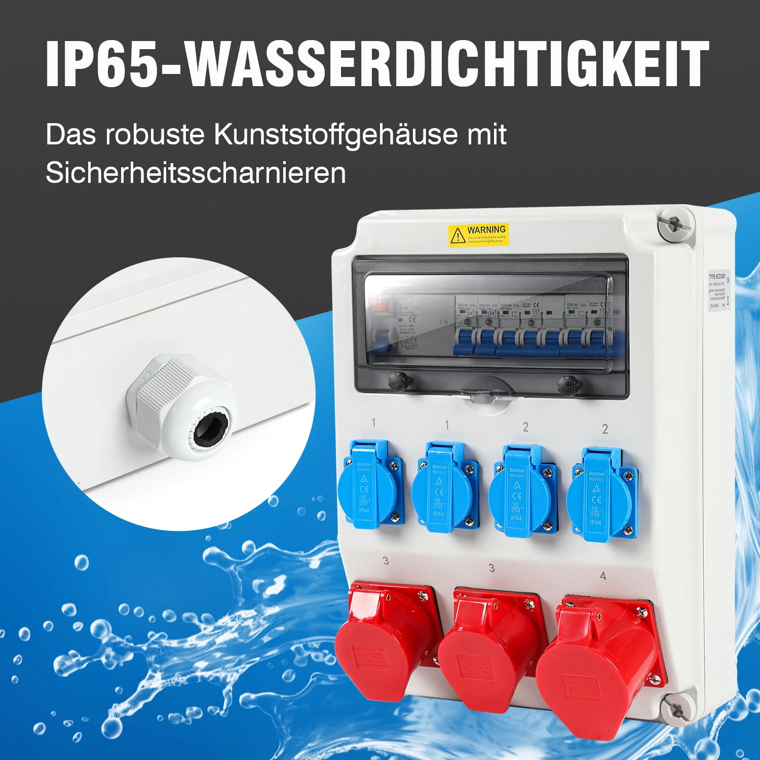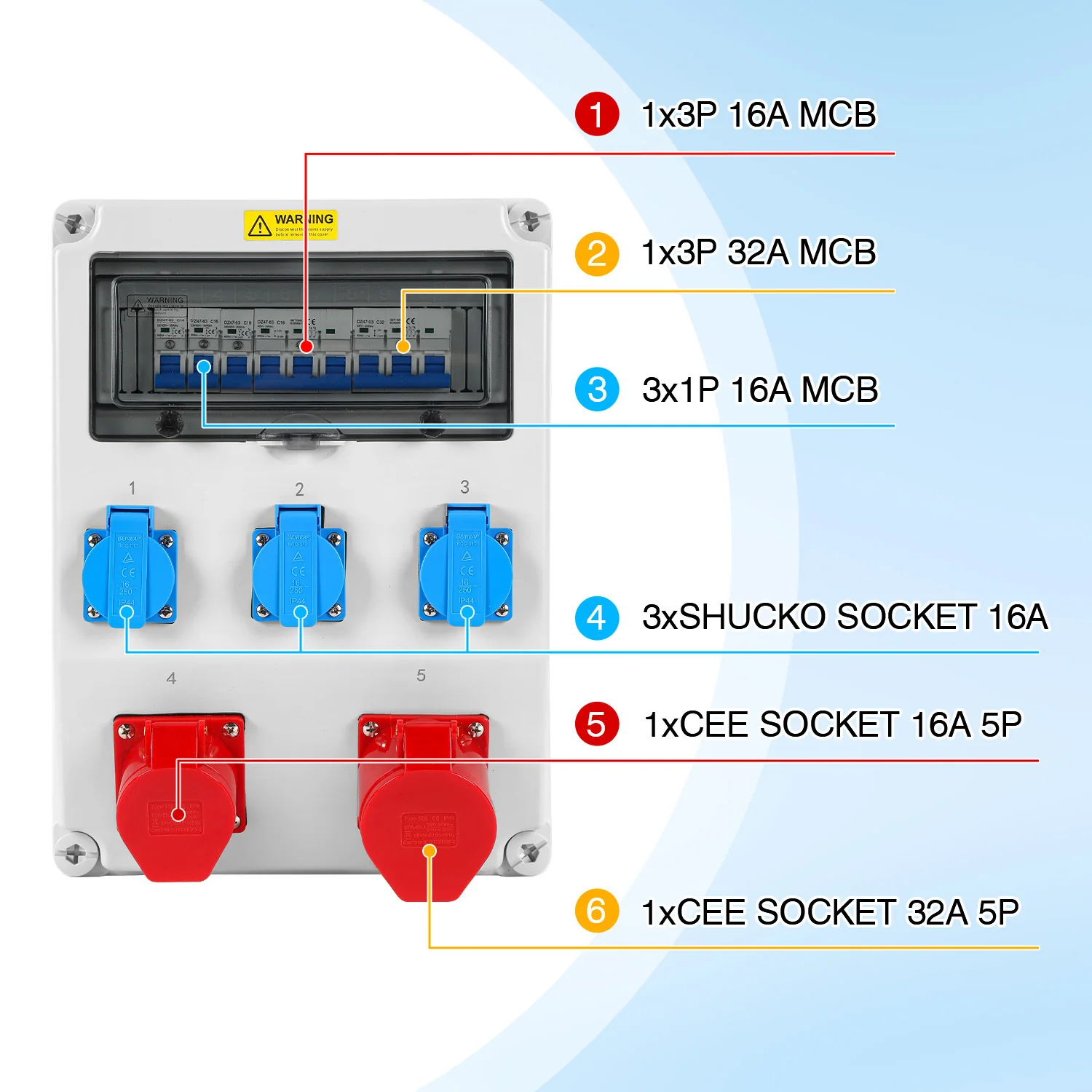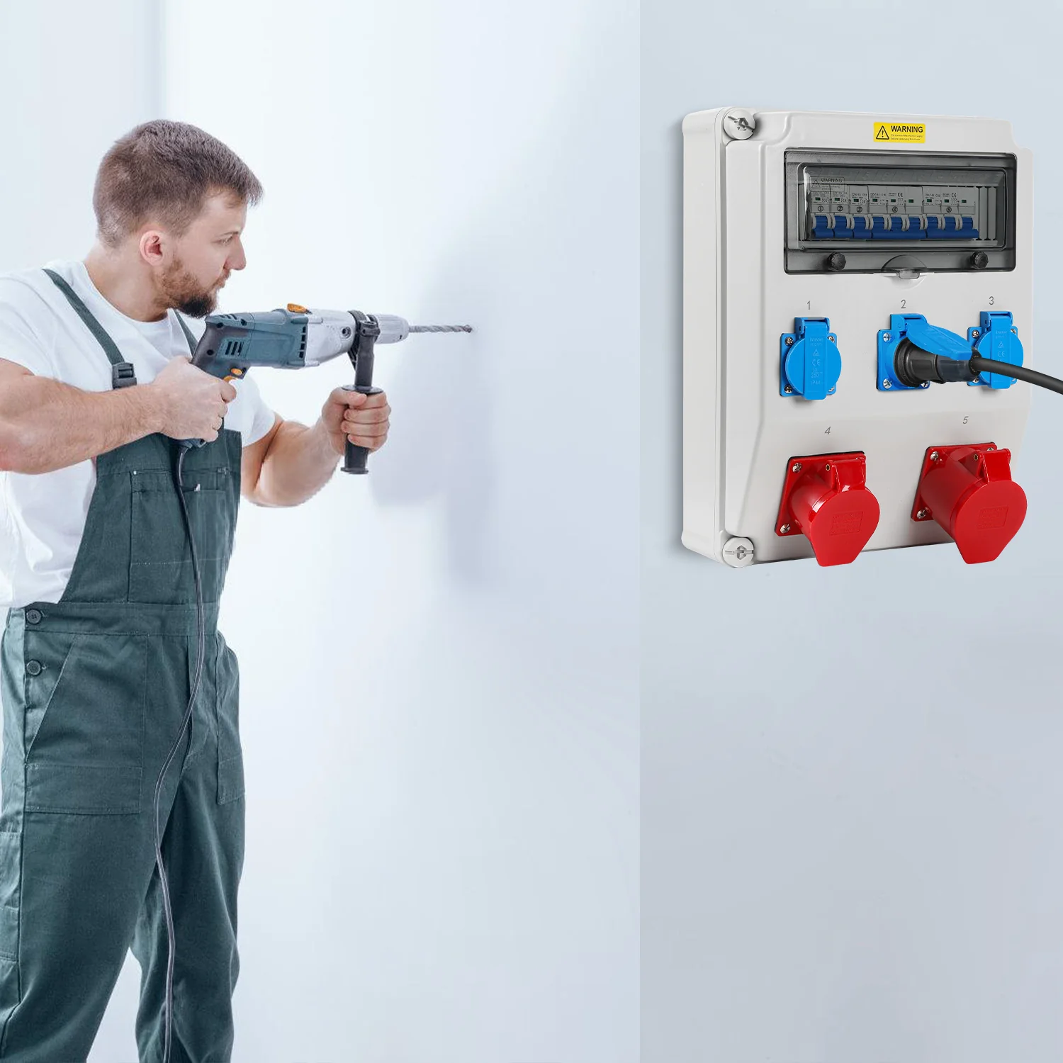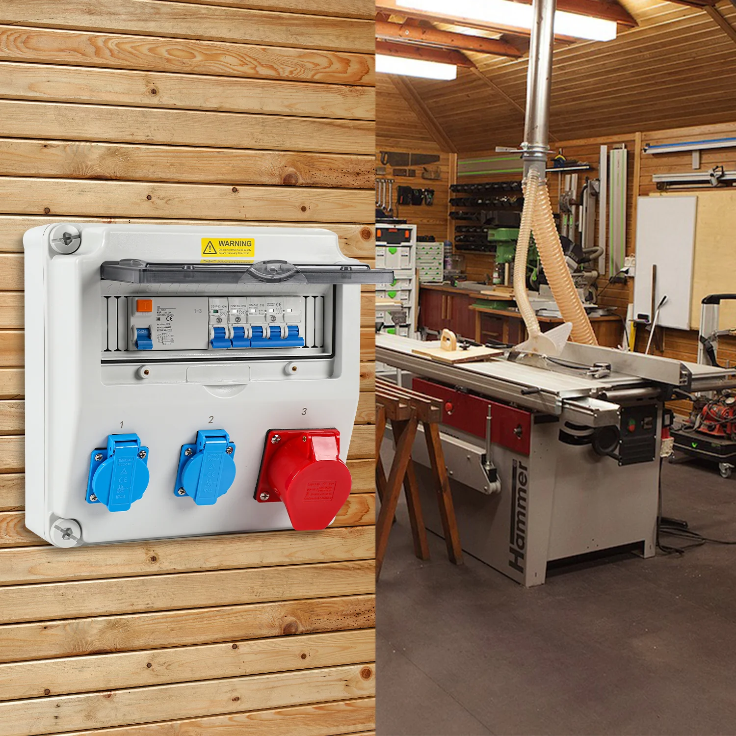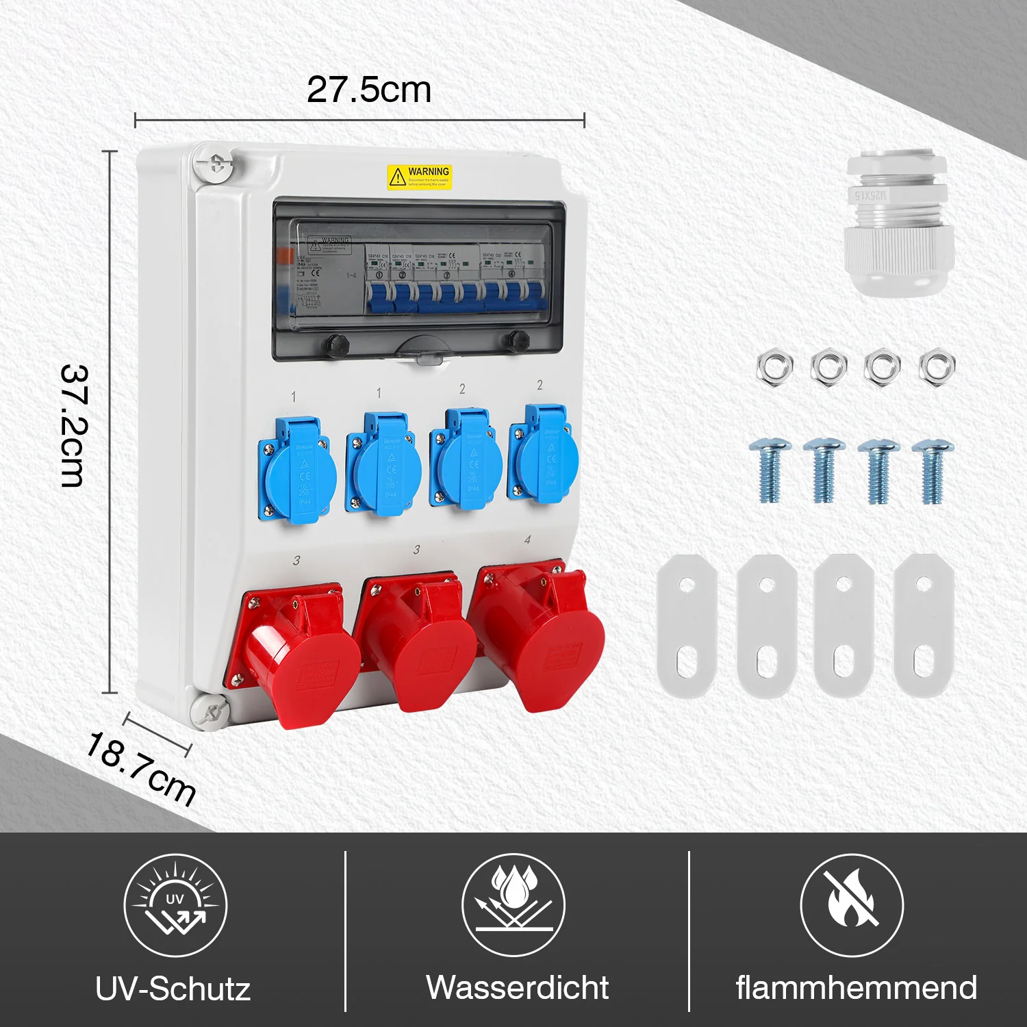 Wandverteiler mit Leitungsschutzschalter,5 Polig Baustromverteiler mit 3xSchuko-Steckdose und CEE-Steckdose 16/32A
