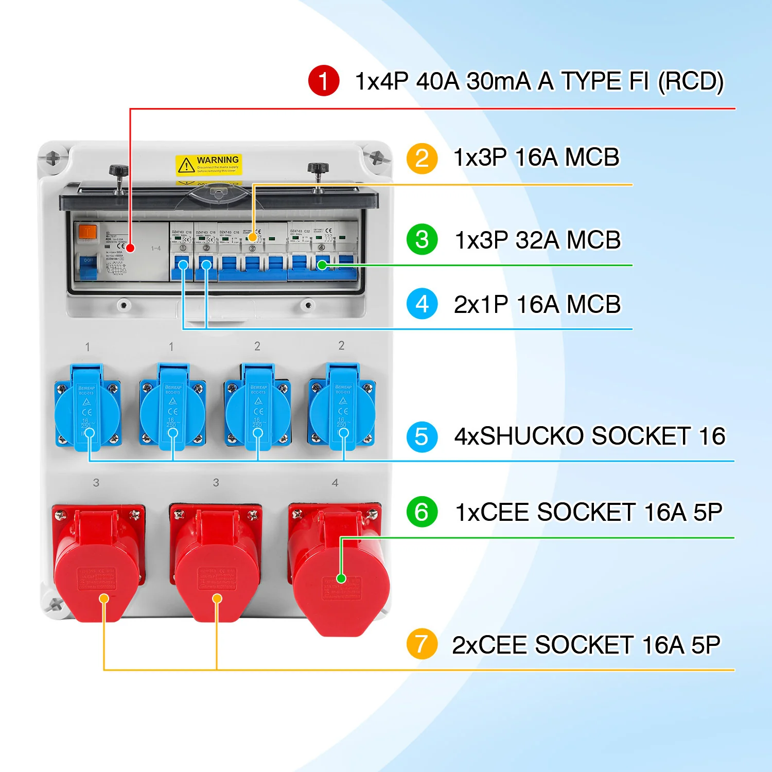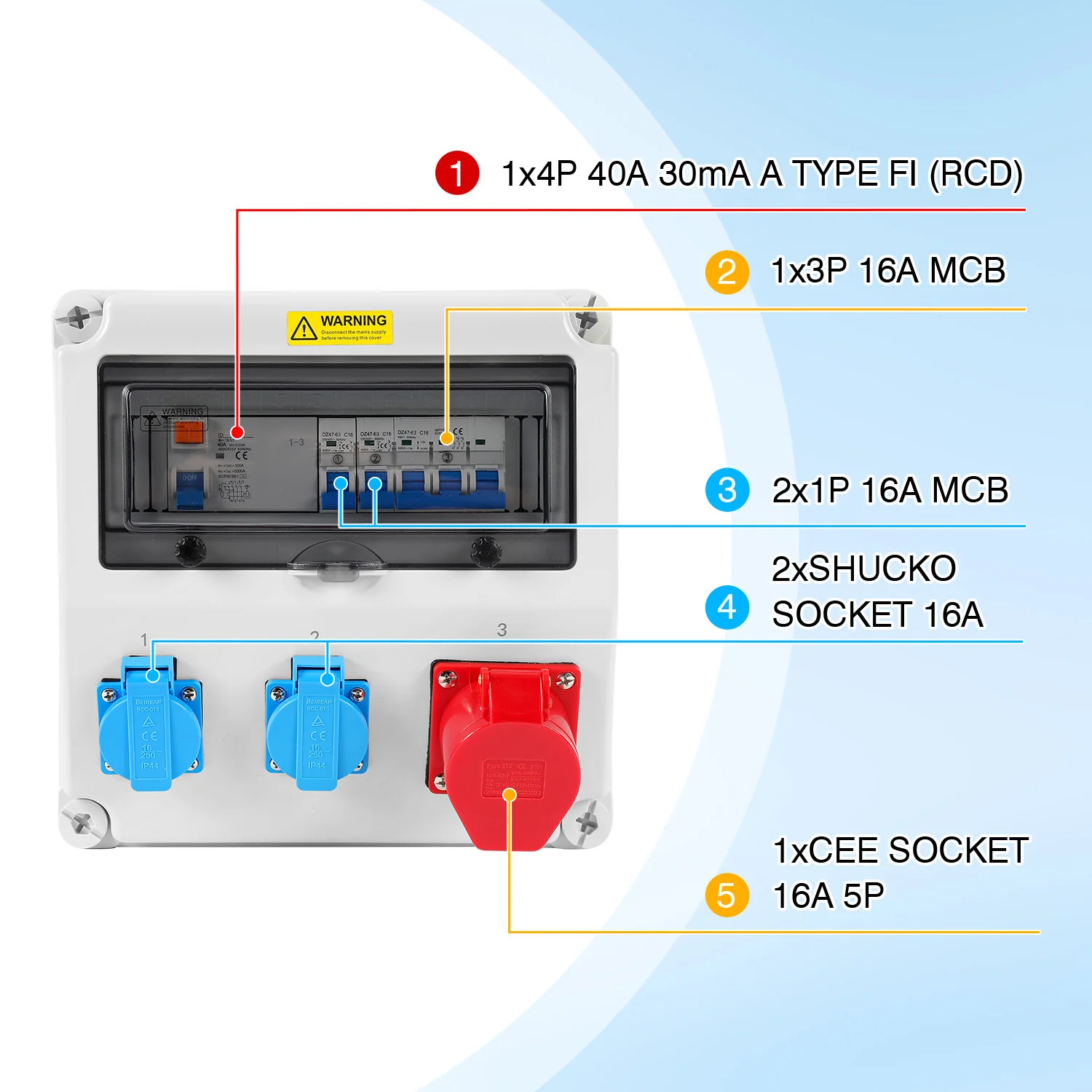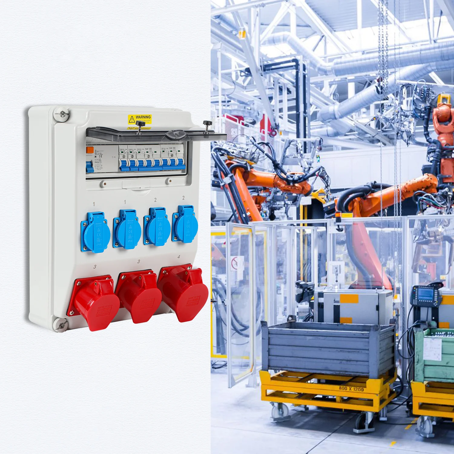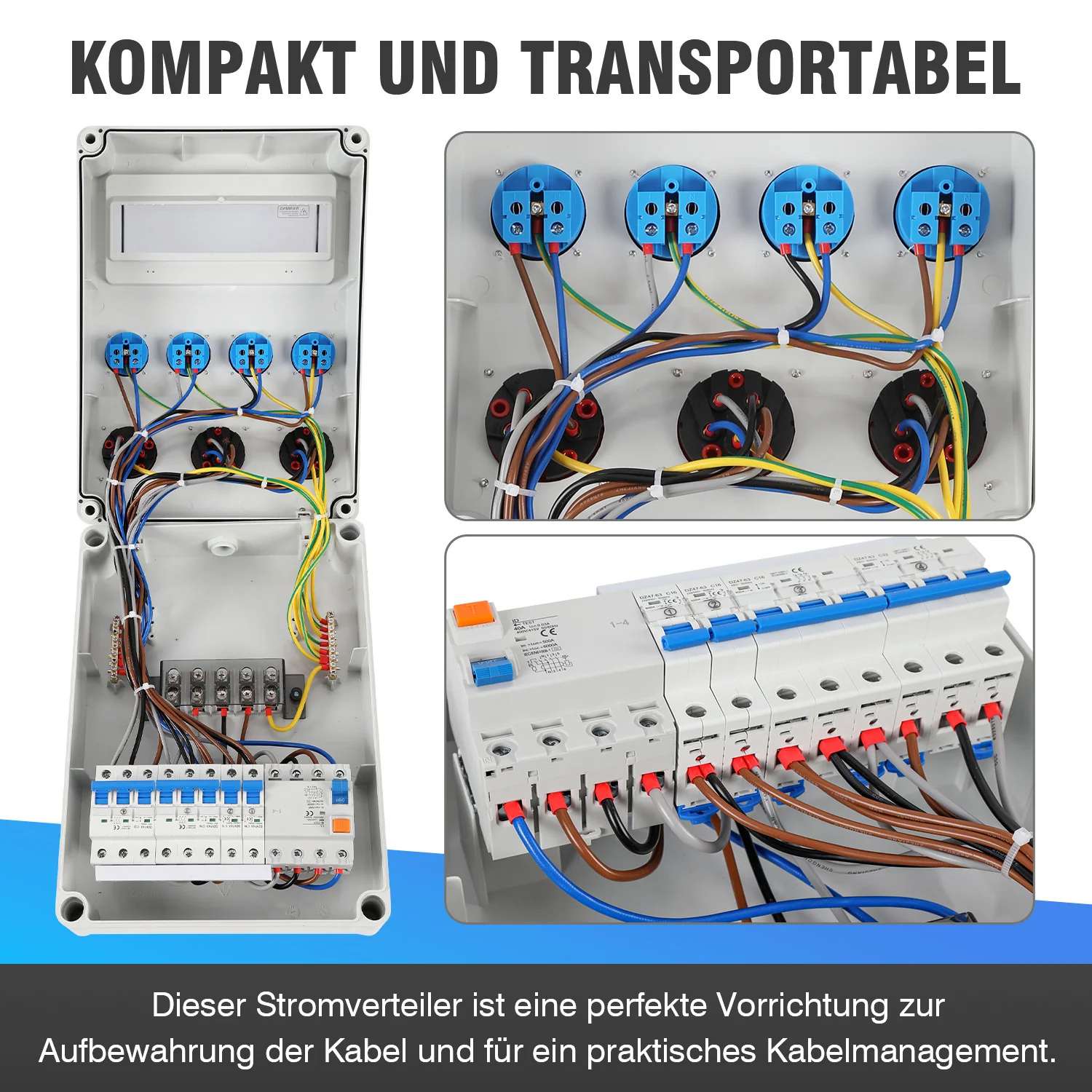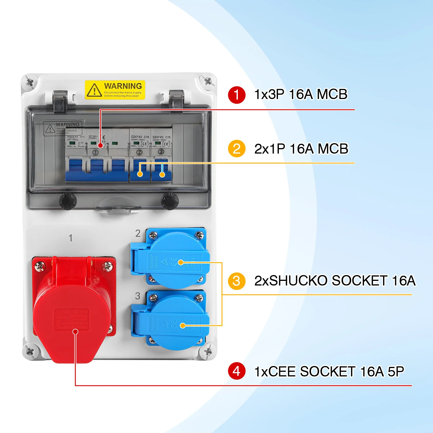 Wandverteiler mit Leitungsschutzschalter,5 Polig Baustromverteiler mit 3xSchuko-Steckdose und CEE-Steckdose 16/32A