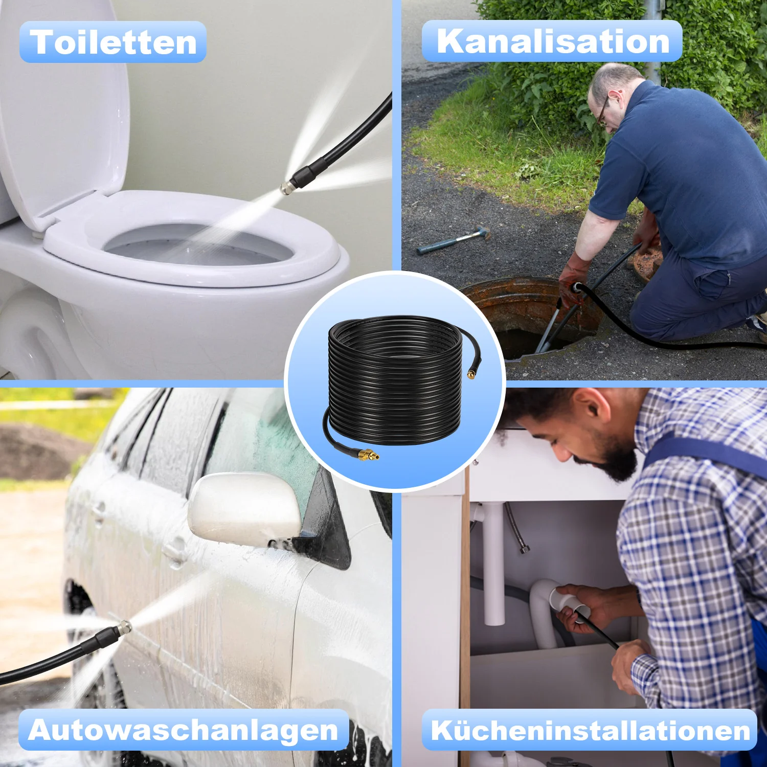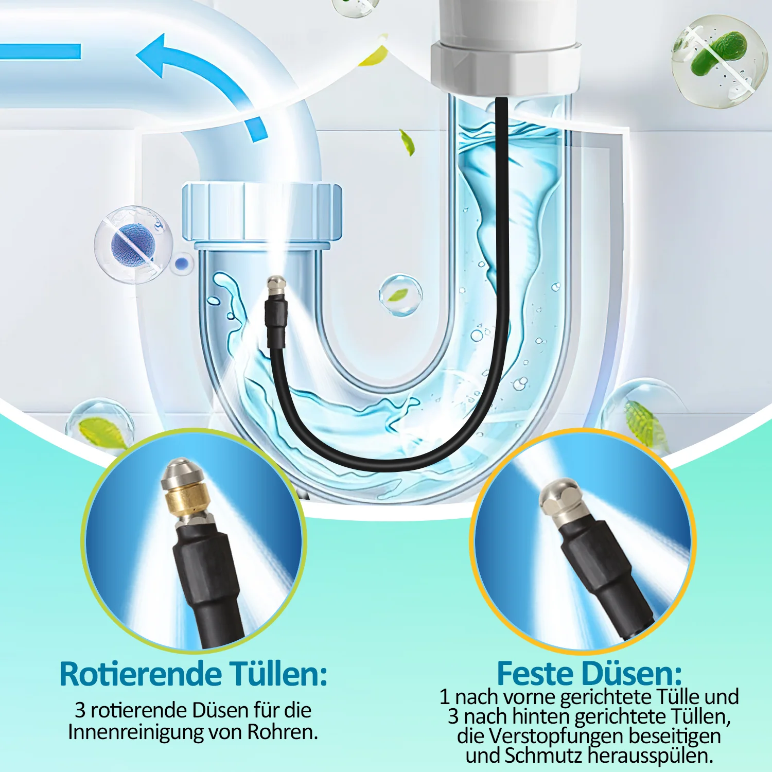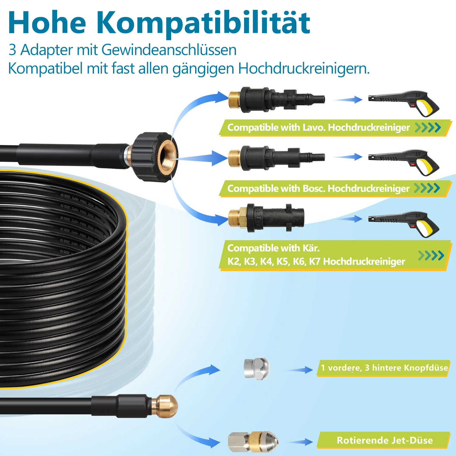 Rohrreinigungsschlauch 10M-30M mit starren und schwenkbaren Düsen, 3 Adapter